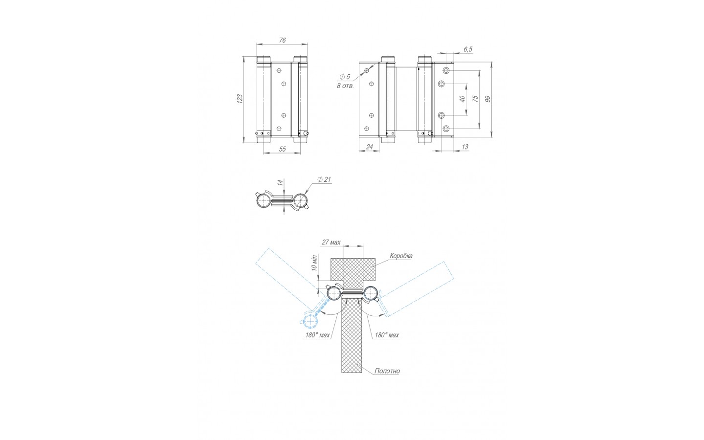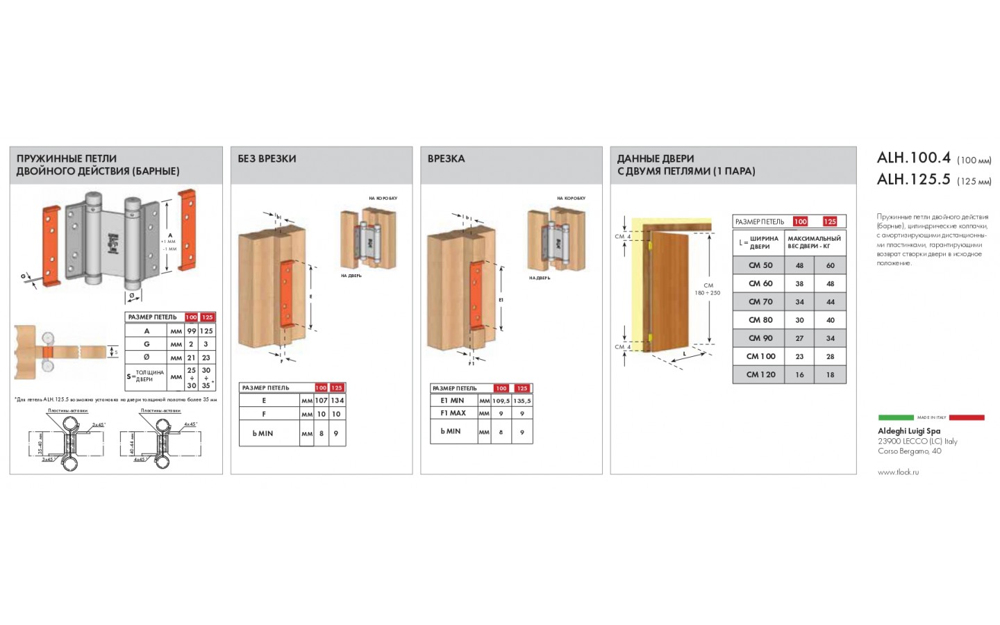 Петля двусторонняя (она же барная, пружинная, петля метро) применяется для деревянных дверей. Позволяет двери открываться в обе стороны, возвращает дверь в центральное положение (в створ). Выполнена из высококачественных материалов. Мах толщина дверного полотна 100.4 = 30 мм; 125.5 = 40 мм Производство: Италия.