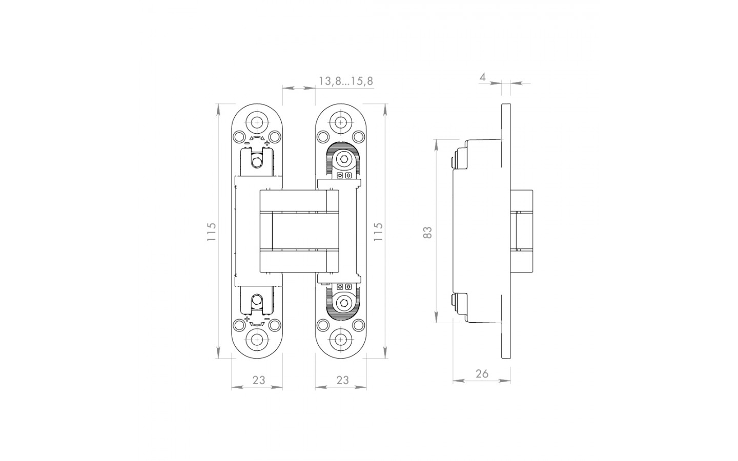 Скрытые петли Armadillo U3D3000 подходят для установки в деревянные межкомнатные двери, двери с алюминиевой кромкой, тонкие двери и двери с притвором U3D3000 - универсальные петли для дверей с левым и правым открыванием Петли скрытой установки U3D3000 предназначены для установки в межкомнатные двери толщиной от 35 мм и с уменьшенной толщиной коробки до 20,5 мм. Рассчитаны на нагрузку до 40 кг при установке двух петель. Невидимы на закрытой двери и обеспечивают угол открывания до 180 градусов. Бесшумны и плавны в работе за счёт нейлоновых вставок на подвижной части конструкции. Легко регулируются в трех плоскостях уже после завершения монтажа. Регулируются в трех плоскостях: по горизонтали ±1 мм, высоте ±2 мм и притвору -1,5\+2,5 мм Декоративные накладки входят в комплект. Соответствуют типоразмерам AGB ECLIPSE 3.0