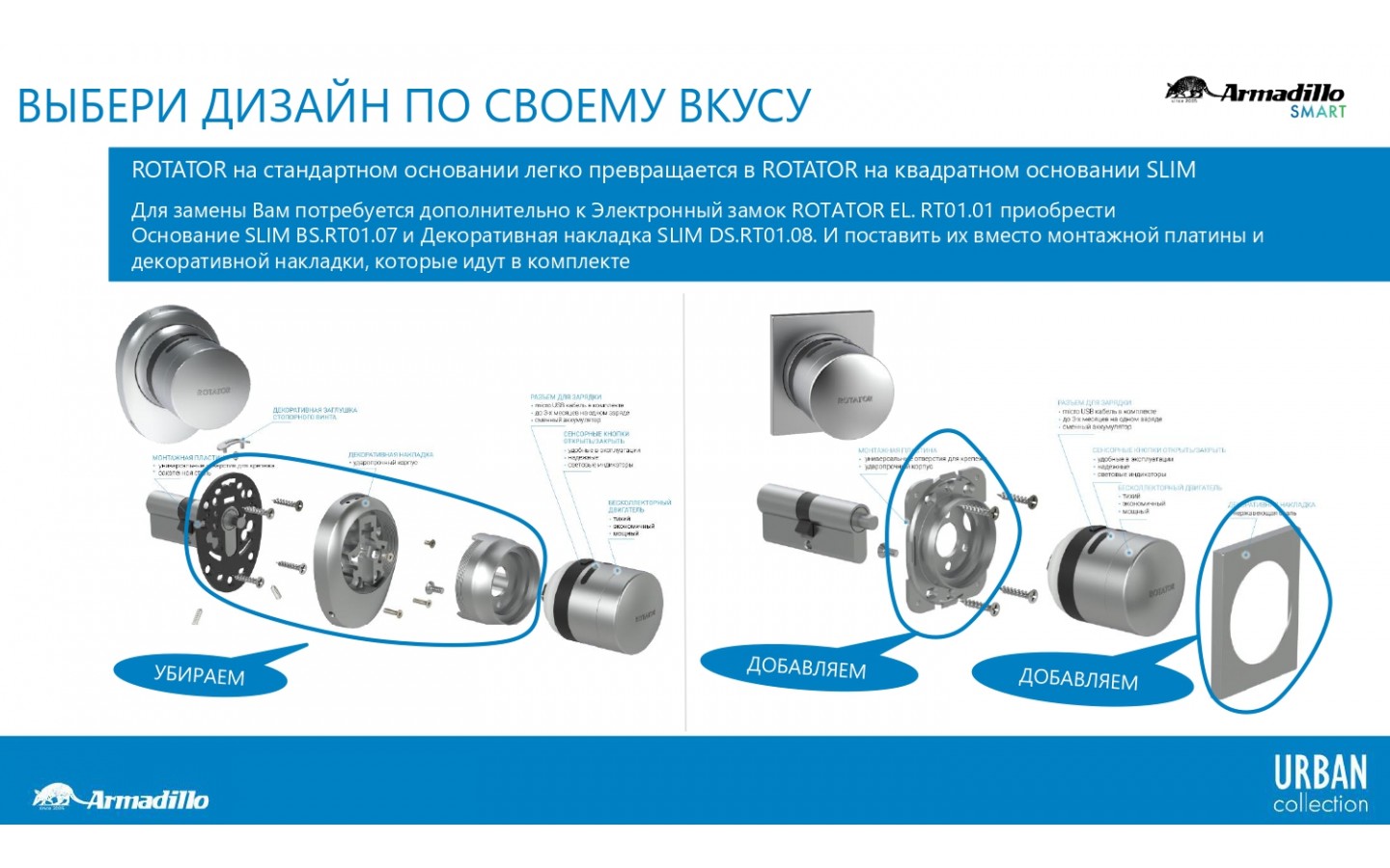 ROTATOR на стандартном основании легко превращается в ROTATOR на квадратном основании SLIM. Для замены Вам потребуется дополнительно к Электронный замок ROTATOR EL. RT01.01 приобрести Основание SLIM BS.RT01.07 и Декоративная накладка SLIM DS.RT01.08. И поставить их вместо монтажной платины и декоративной накладки, которые идут в комплекте. Декоративная накладка SLIM DS.RT01.08 выполнена из нержавеющей стали. Имеет 5 цветовых решений
