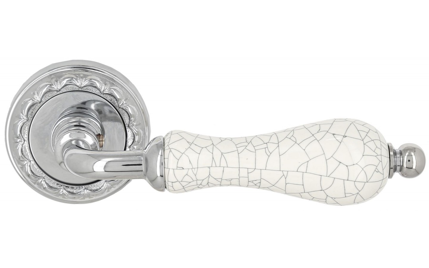Дверные ручки DANA CRACKLE 306 на розетке изготовлены на одной из крупнейших фабрик – Extreza. Материал конструкции — Латунь высокого качества. Она не подвержена коррозионным процессам, выдерживает значительные нагрузки и многолетнюю эксплуатацию. Корпус покрыт несколькими слоями гальванического покрытия. Оно усиливает защиту от коррозии и придает дверной ручке привлекательный вид. Цвет покрытия Полированный хром