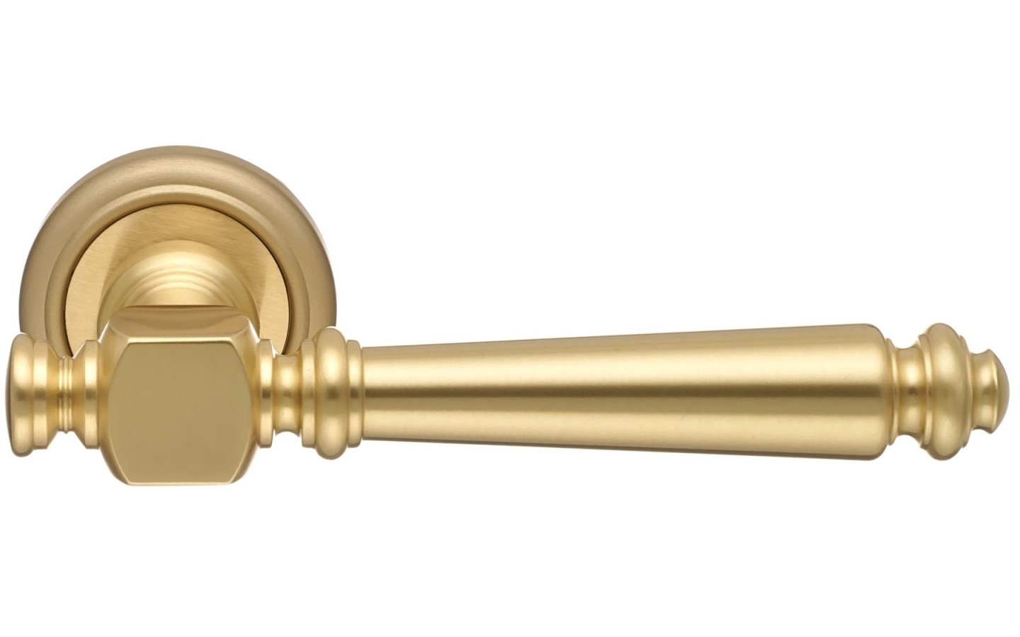 Дверные ручки Veronika 327 на розетке изготовлены на одной из крупнейших фабрик – Extreza. Материал конструкции — Латунь высокого качества. Она не подвержена коррозионным процессам, выдерживает значительные нагрузки и многолетнюю эксплуатацию. Корпус покрыт несколькими слоями гальванического покрытия. Оно усиливает защиту от коррозии и придает дверной ручке привлекательный вид. Цвет покрытия Матовое золото