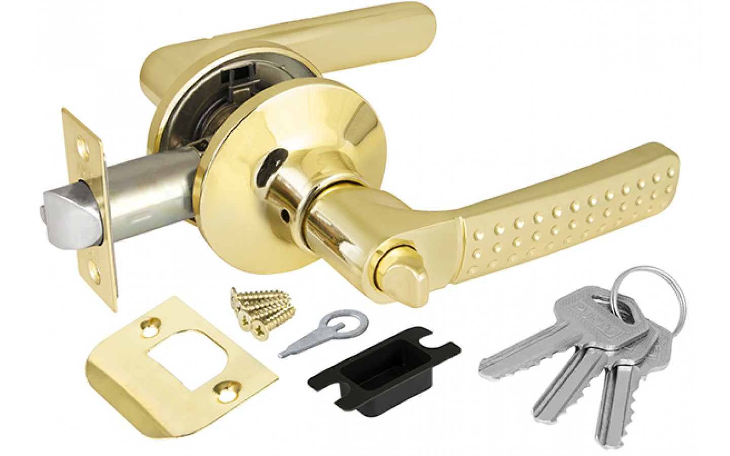 Комплект дверных ручек с защелкой (KNOB) Punto предназначен для установки в межкомнатные двери толщиной 35-45 мм. Подходит для дверей правого и левого открывания. Гальваническое покрытие прошло тест на устойчивость к коррозии в соляном тумане и соответствует 1 классу ГОСТ. Ресурс работы ручек-защелок более 150 000 циклов открывания/закрывания, что гарантирует безотказную работу двери более чем на 15 лет. Бэксет защелки регулируется - 60/70 мм. Модификация: ключ/фиксатор. Цвет: золото. Комплектация: защелка, ответная планка с декоративной заглушкой, дверные ручки, крепежная фурнитура, 3 ключа, инструкция по установке.