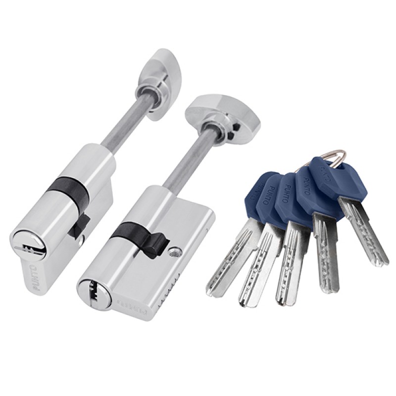 Цилиндровый механизм Punto коллекции SIMPLE LIVING Z407 предназначен для установки в корпус врезных цилиндровых замков для всех типов дверей. Наличие проточек на штифтах данного цилиндра препятствует вскрытию замка отмычками. Вариант исполнения: ключ-шток с вертушкой. Тип ключа: "перфорированный". Материал ключа: латунь с ударопрочной пластиковой эргономичной головкой. Материал ротора: латунь. Количество пинов: 7. Секретность: более 78 000 комбинаций. Работоспособность: более 200 000 циклов открывания/закрывания. Размер штока: 65 мм. Цвет: хром. Комплектация: 5 ключей, крепёжный винт 70 мм, вертушка, шестигранник. Упаковка: картон.