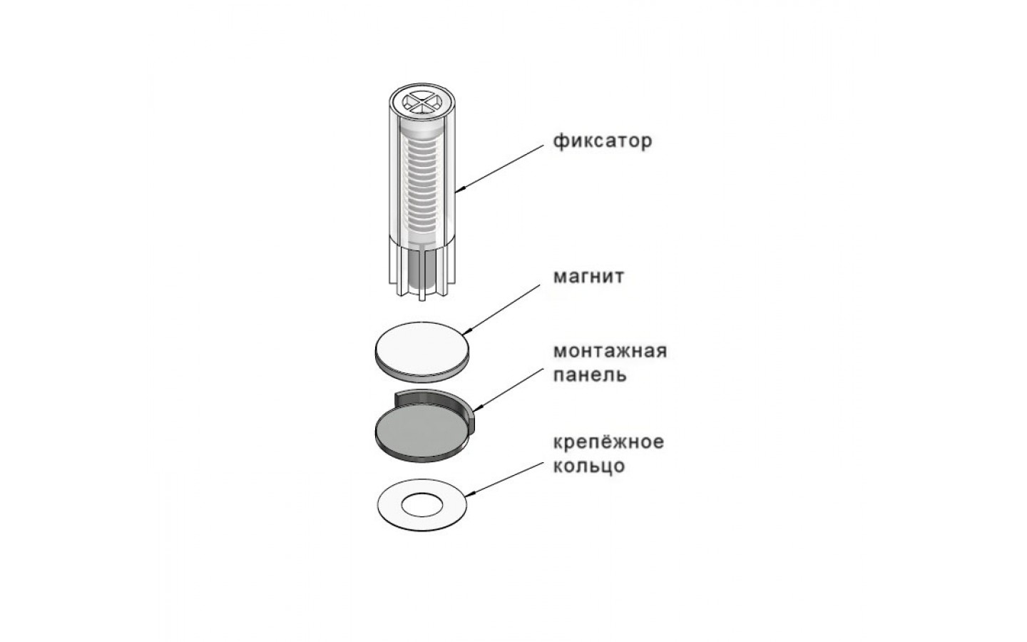 Комплектация стопора содержит монтажную панель с редкоземельными неодимовым магнитом и фиксатор в полимерном корпусе с металлическим штифтом. Фиксатор врезается в торец дверного полотна, а монтажная панель с магнитом крепится на пол с помощью клейкой ленты ЗМ для особо прочной фиксации.