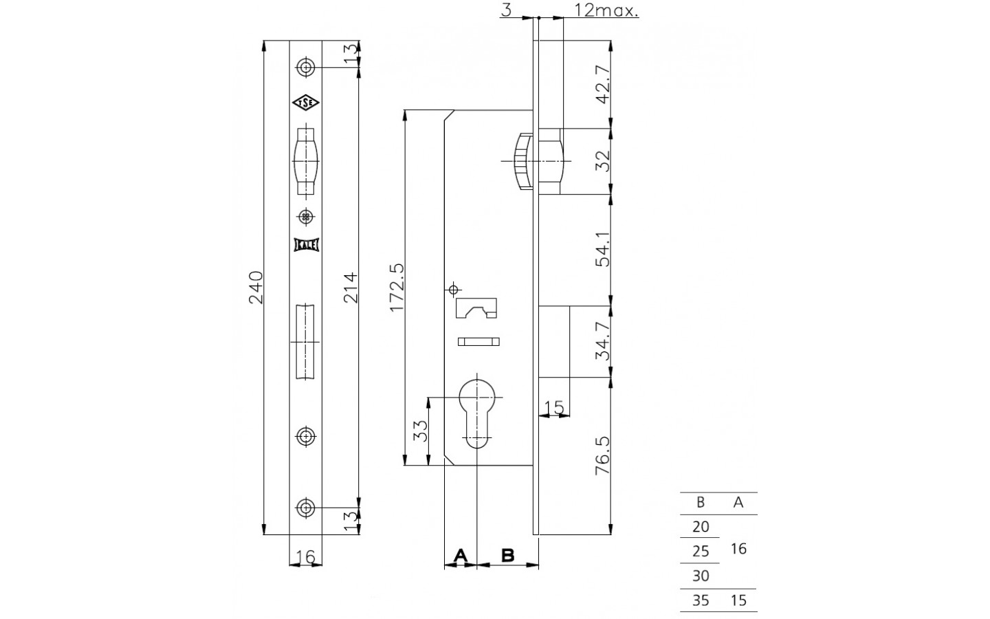 Корпус Kale kilit (Кале килит) узкопрофильного замка с роликовой защёлкой 155/P (35 mm) w/b (хром) (без отв. планки)