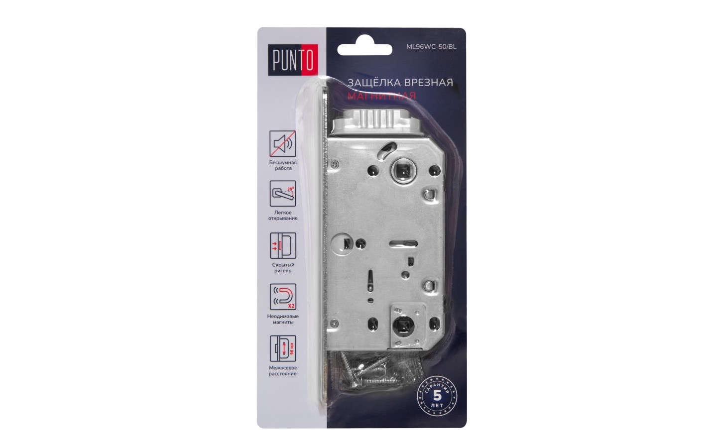 Дверная магнитная защелка Punto серии ML96WC-50/BL предназначена для установки в деревянные межкомнатные и сантехнические двери, подходит для дверей левого и правого открывания. Корпус выполнен из стали. Бесшумность работы обеспечивается за счет магнитного механизма, который фиксирует дверь только в закрытом положении. Защелка прошла испытания и имеет высший 4 класс надежности (250 000 циклов открывания/закрывания), что позволяет рекомендовать их для установки на двери помещений с большой проходимостью. Упаковка : блистер.