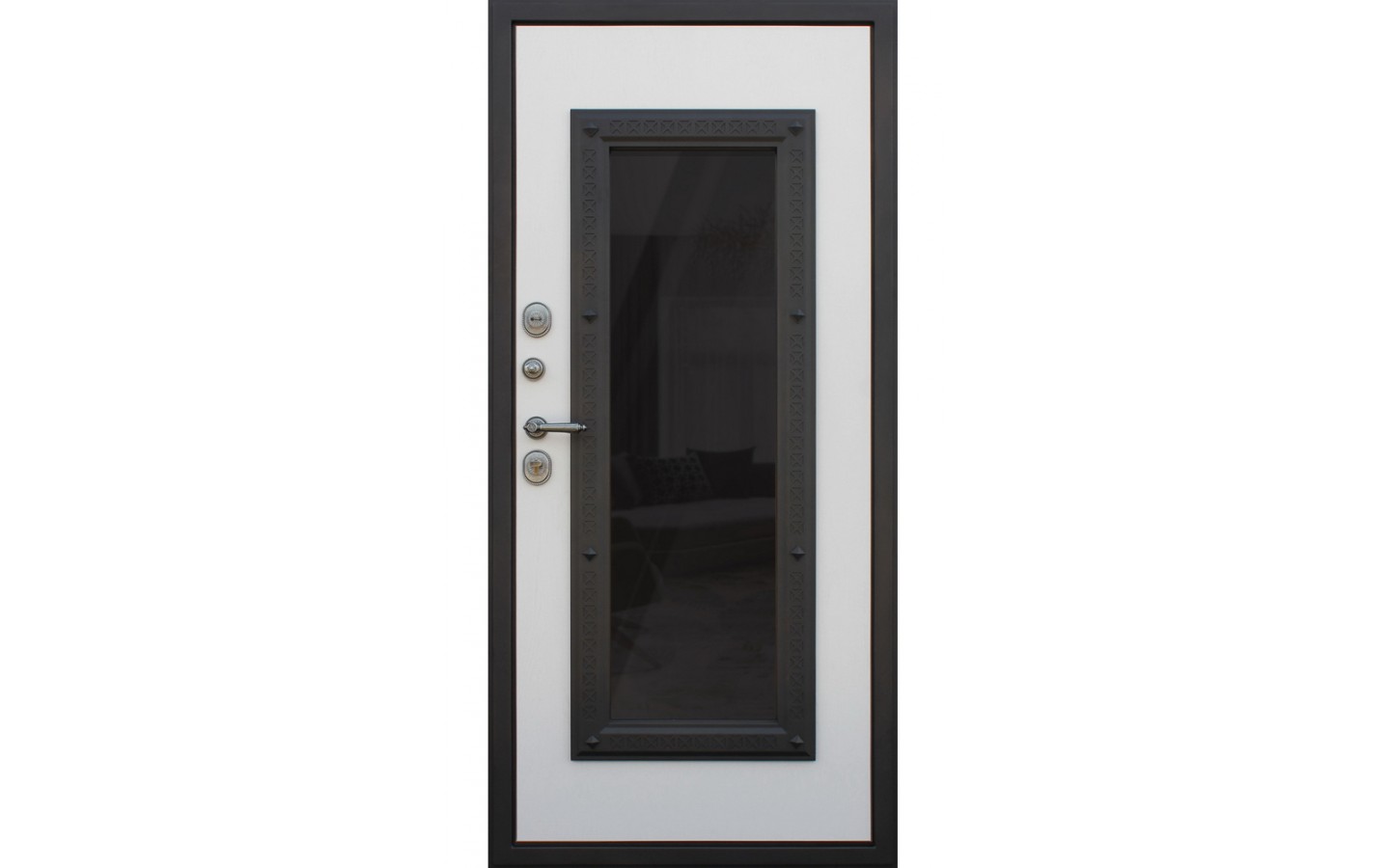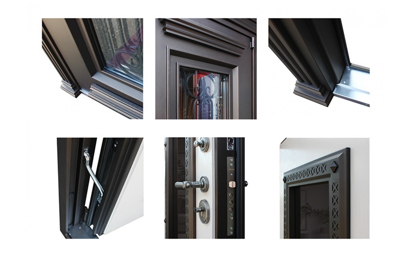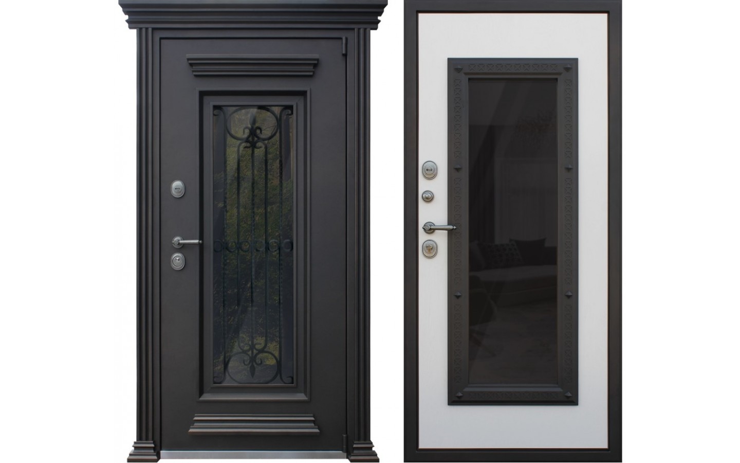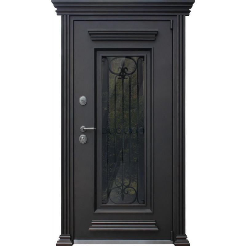 | Внешняя отделка | Лист металла 1, 8 мм. Два слоя покрытия. Металлофиленки. Двухкамерный стеклопакет с тонировкой (цвет бронза). Ковка внутри стеклопакета. LEDподсветка. Наличник фигурный. |