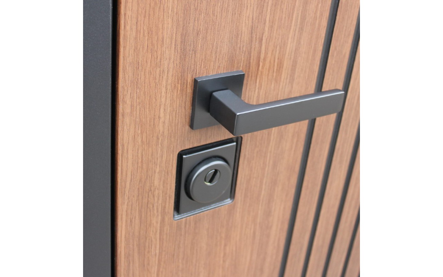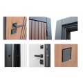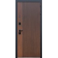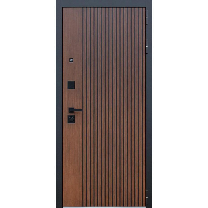 | Внешняя отделка | Лист металла 1, цвет черный кварц., черное патинирование по фрезеровке. Наличник МДФ гладкий 80 мм., 5 мм. Экошпонированная дизайнерская панель МДФ 10 мм. Линейная фрезеровка. Цветовая комбинация: дуб кантри темный |