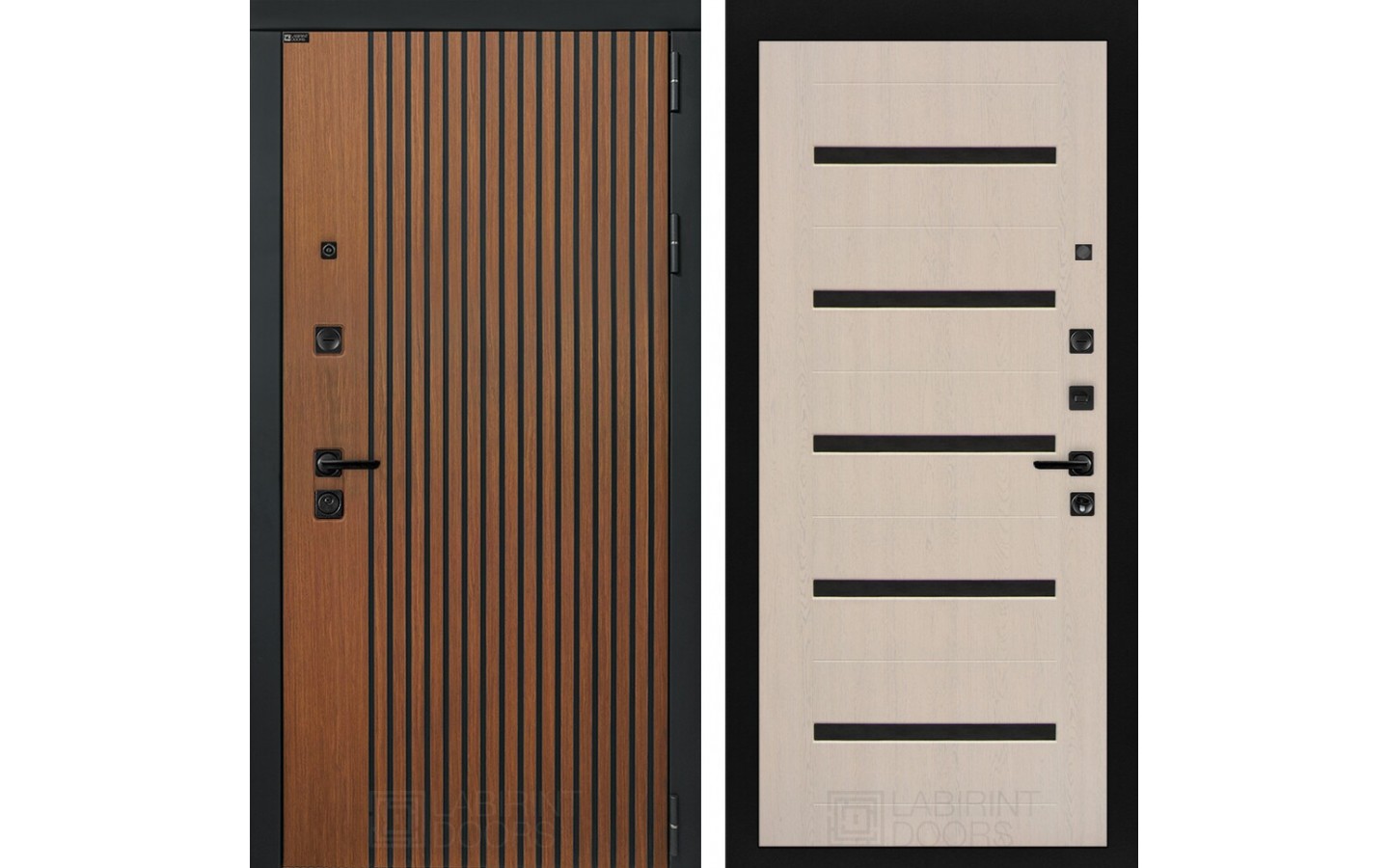 | Тип отделки двери | Декоративная МДФ панель 10 мм в цвете 'Дуб кантри темный' с черной патиной, наличники 'Черный кварц' |