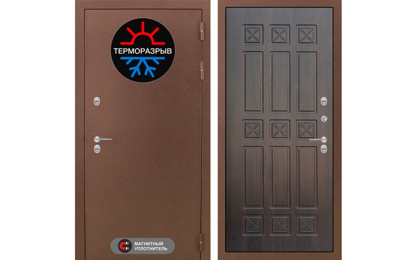 | Тип отделки двери | Металл с 2-х слойным покрытием. 1 слой - цинкосодержащий грунт, 2 слой - покраска 'Антик' медный |
