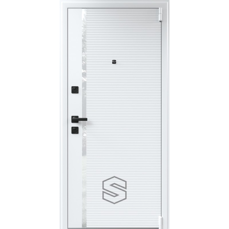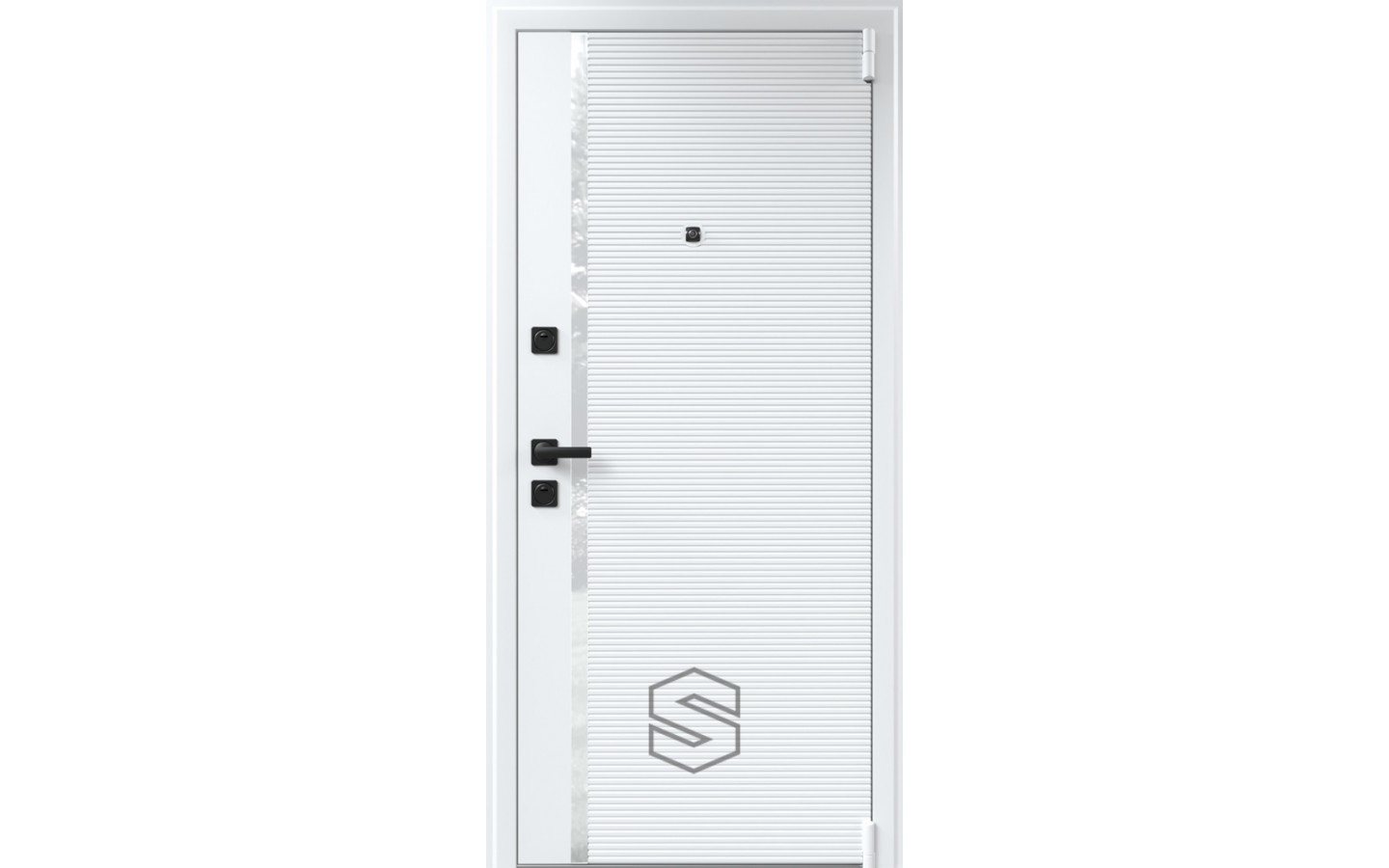 Дверное полотно утоплено. Подобная конструкция существенно увеличивает стойкость двери к взлому путем отжима. Установленные П-образные ребра внутри придают полотну дополнительную жесткость и устойчивость к силовому воздействию на отжим.