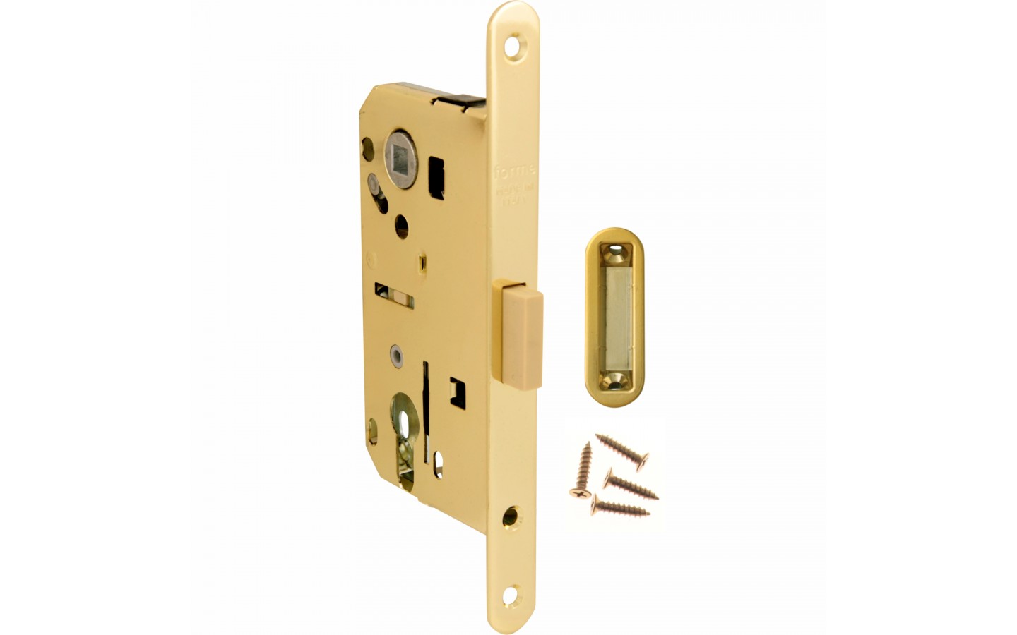 Замок врезной Magnetico F140.13.02 Cyl цилиндрический c ответной планкой и шурупами, латунь полированная производство Forme Италия